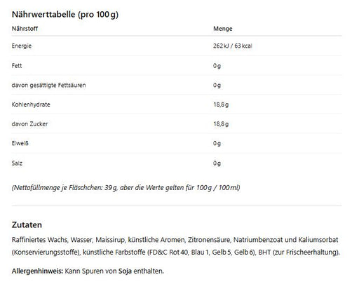 Vollständige Details anzeigenZutaten Raffiniertes Wachs, Wasser, Maissirup, künstliche Aromen, Zitronensäure, Natriumbenzoat und Kaliumsorbat (Konservierungsstoffe), künstliche...
