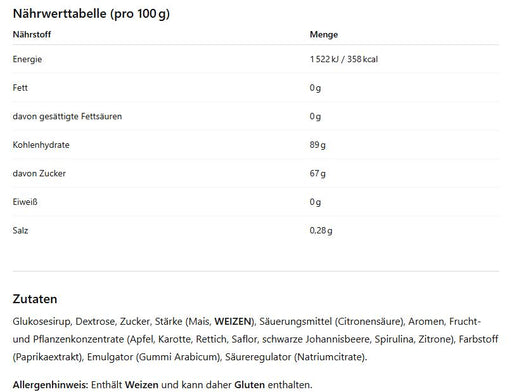 Zutaten Glukosesirup, Dextrose, Zucker, Stärke (Mais, WEIZEN), Säuerungsmittel (Citronensäure), Aromen, Frucht- und Pflanzenkonzentrate (Apfel, Kar...