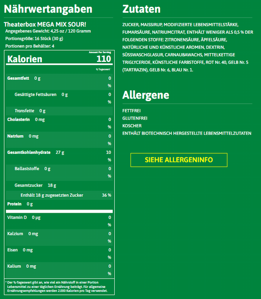 Vollständige Details anzeigenMEGA-MIX 🧾 Zutaten : Zucker, Maissirup, modifizierte Lebensmittelstärke, enthält weniger als 0,5 % der folgenden Stoffe: Fumarsäure, natürliche un...