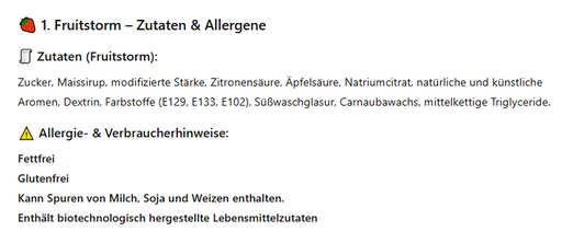 Vollständige Details anzeigen🍓 1. Fruitstorm – Zutaten & Allergene 🧾 Zutaten (Fruitstorm): Zucker, Maissirup, modifizierte Stärke, Zitronensäure, Äpfelsäure, Natriumcitra...