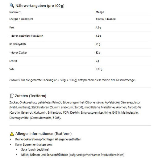 🧾Zutaten: Zucker, Glukosesirup, gehärtetes Palmöl, Säuerungsmittel (Citronensäure, Apfelsäure), Säureregulator (Natriumcitrate), Stabilisatoren (Gu...