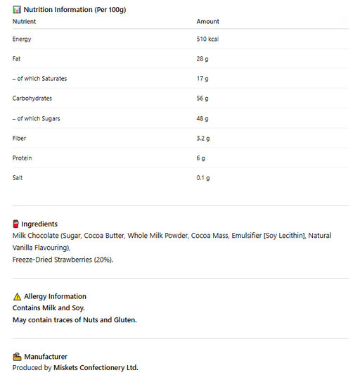 Vollständige Details anzeigenIndulge in the perfect blend of fruity freshness and creamy sweetness with Miskets Freeze Dried Strawberry Chocolate. Each bite offers a satisfying...