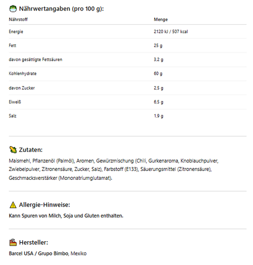 Vollständige Details anzeigen🧾 Zutaten Variiert je nach Geschmack, typischerweise enthalten: Weizenmehl, Pflanzenöl, Salz, Curry-Gewürzmischung, Zucker, Gewürze, Verdickungsmit...
