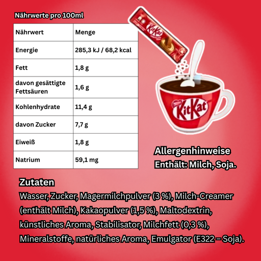 View full detailsProduktbeschreibungDer KitKat Chocolate Drink ist ein köstliches Getränk mit intensivem Schokoladengeschmack, inspiriert vom beliebten KitKat-Genus...