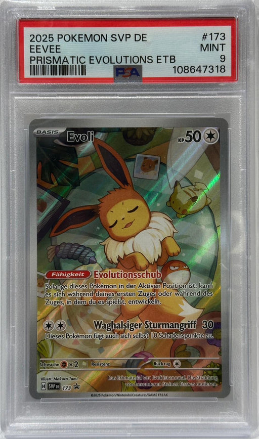View full detailsDiese originale Pokémon-Sammelkarte Evoli stammt aus der Kollektion Prismatic Evolutions und wurde professionell mit PSA 9 (Mint) bewertet. Die Kar...