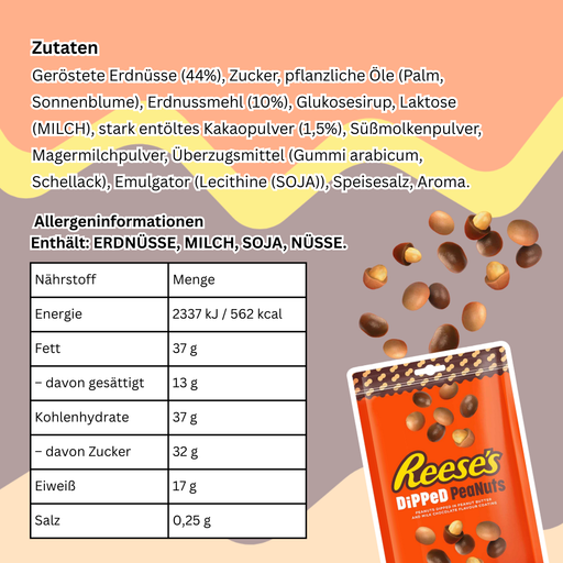 View full details📝 Produktbeschreibung Die Reese’s Dipped Peanuts sind der perfekte Snack für alle, die Erdnüsse und Schokolade lieben. Knackige geröstete Erdnüsse...