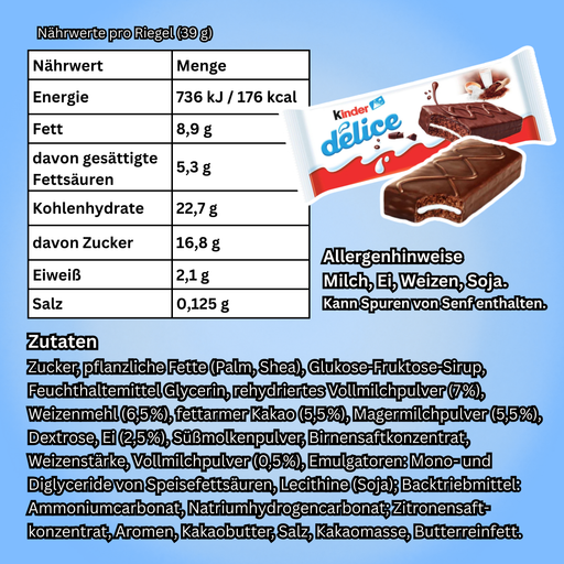 View full detailsProduktbeschreibungFerrero Kinder Délice Cacao ist ein weicher Kakao-Kuchen mit cremiger Milchfüllung (15,5 %) und zarter Kakaofettglasur (24,5 %)....