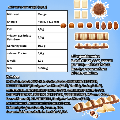 View full details📝 Produktbeschreibung Kinder Bueno White ist eine feine Kombination aus knuspriger Waffel, cremiger Milch-Haselnuss-Füllung und zarter weißer Schok...